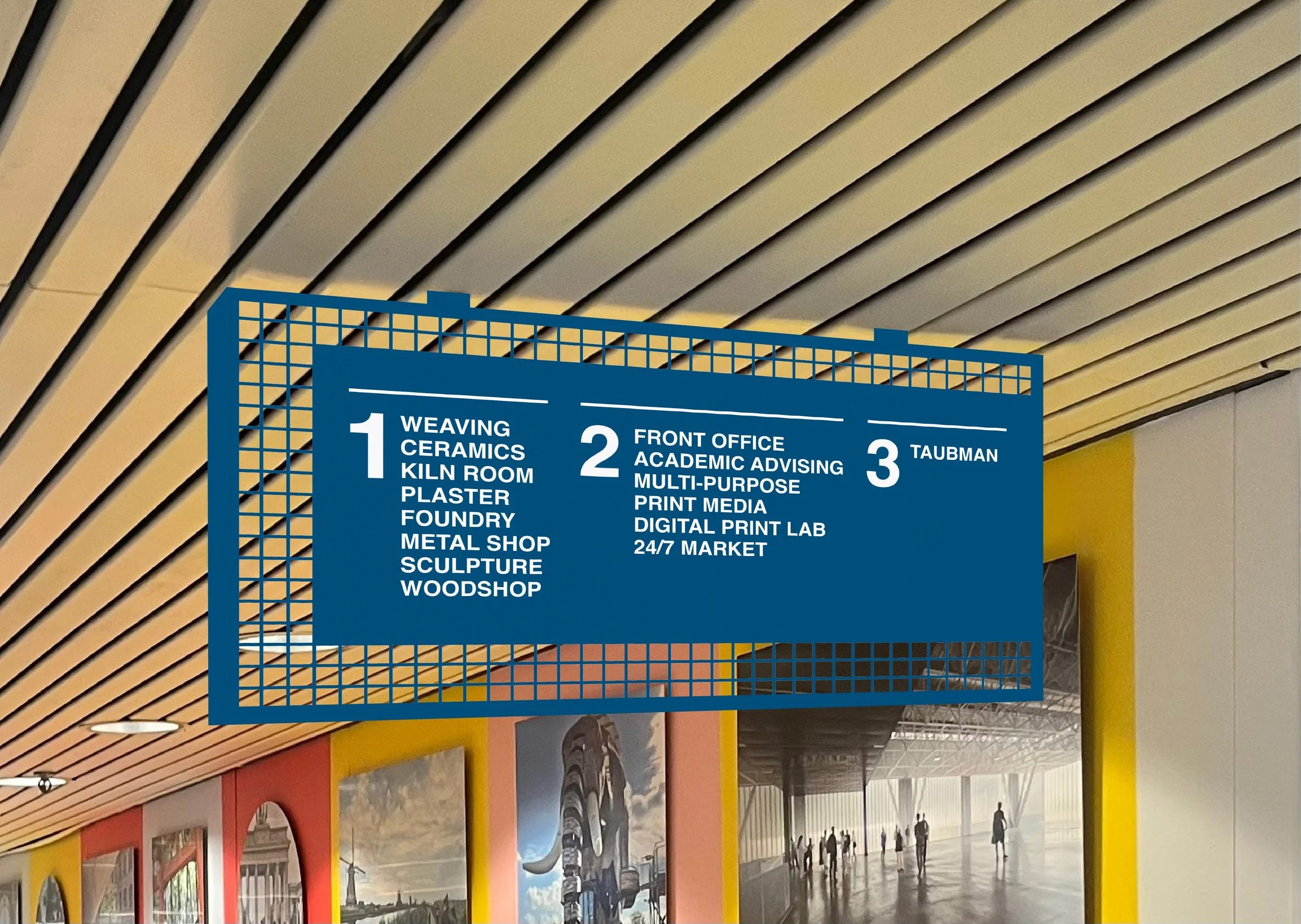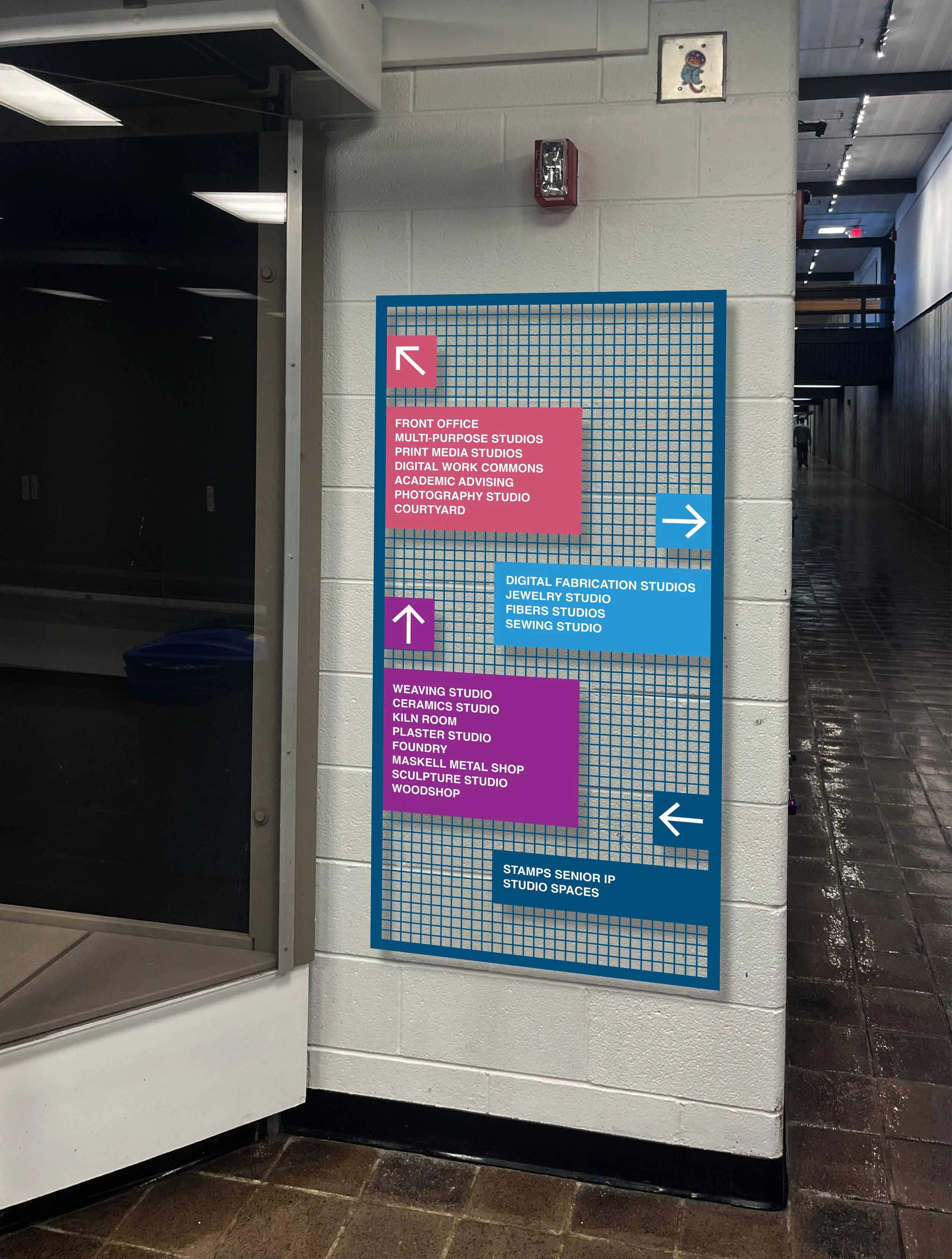 The project explores how type, color, and spatial design can work together to guide movement, enhance accessibility, and reflect the creative identity of the environment. Positioned at the intersection of visual communication and architecture, the work emphasizes clarity, adaptability, and a memorable user experience.